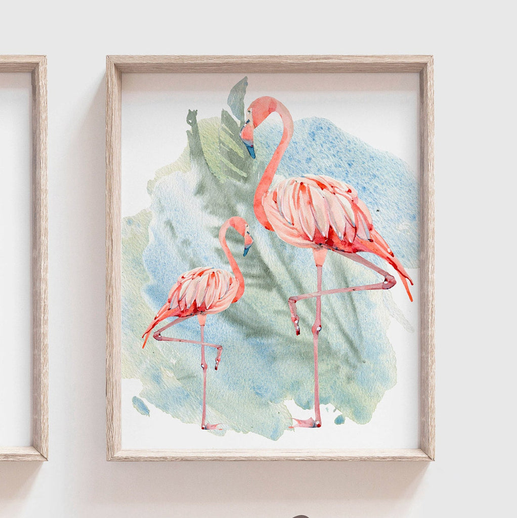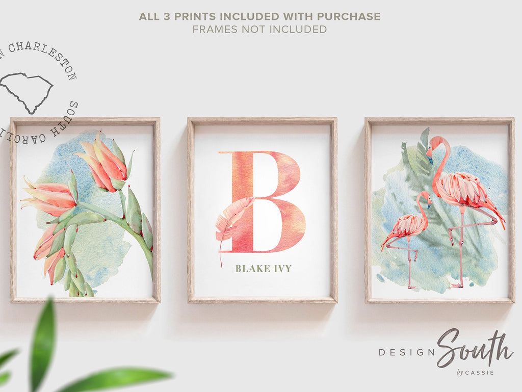 Pink flamingo nursery wall art, jungle theme baby girl decor, fan palm tropical nursery print set, flamingo personalized baby art tropical