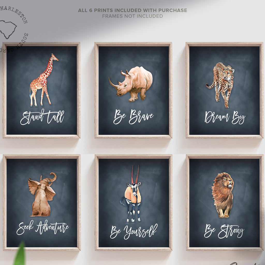 Product description: Safari watercolor animal theme prints including a giraffe, rhinoceros, leopard, elephant, antelope, and lion with dusty navy chalkboard textured backgrounds. You can request to swap out any of the animals with a zebra, heron, flamingo, lioness, ostrich, parrot, or shakal. Please specify in the 'notes to seller' section during checkout. Other options are also available in my shop.