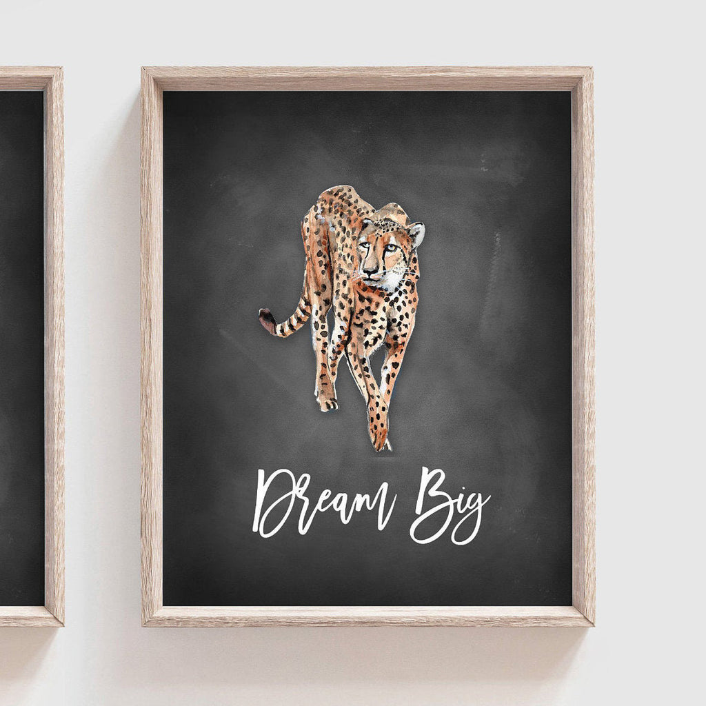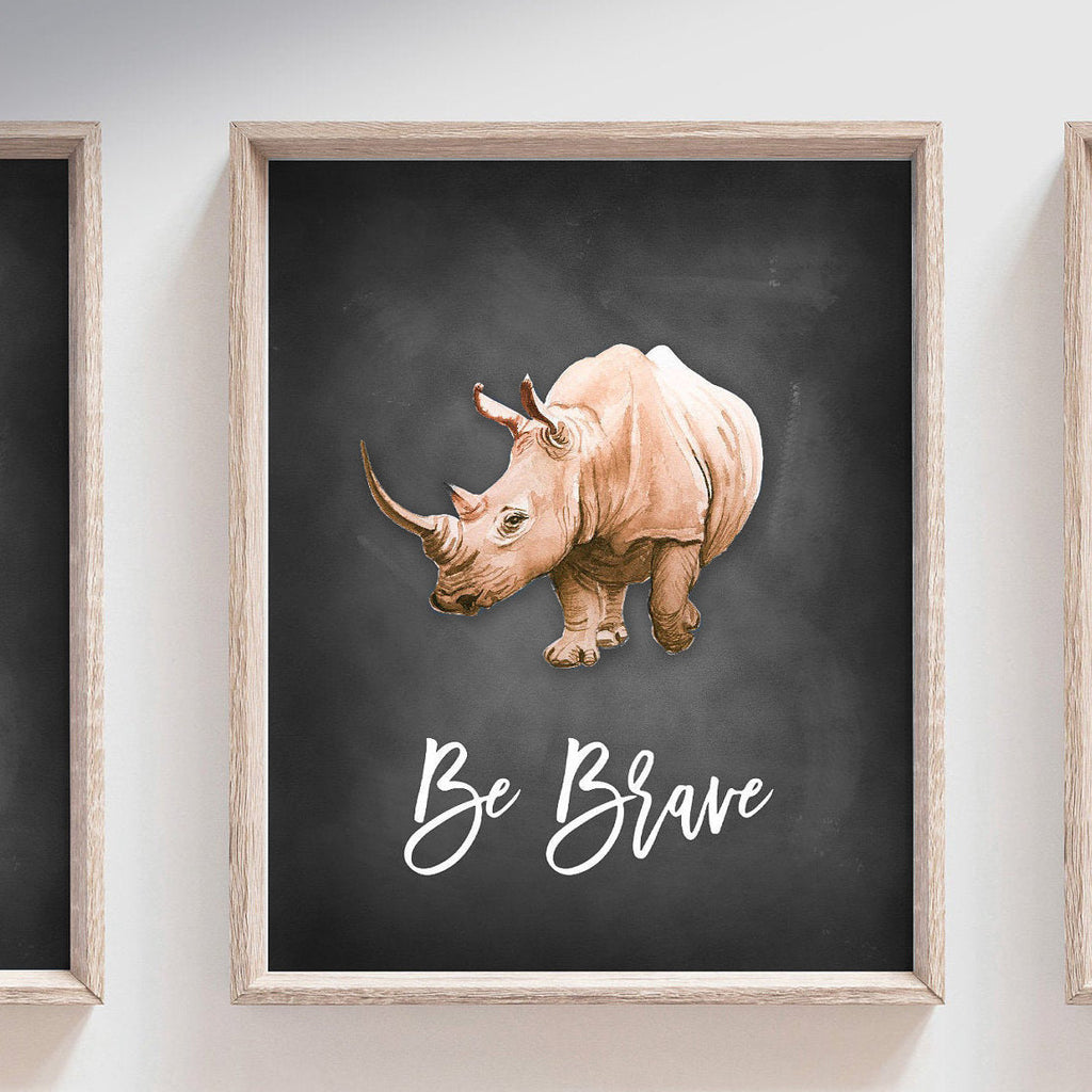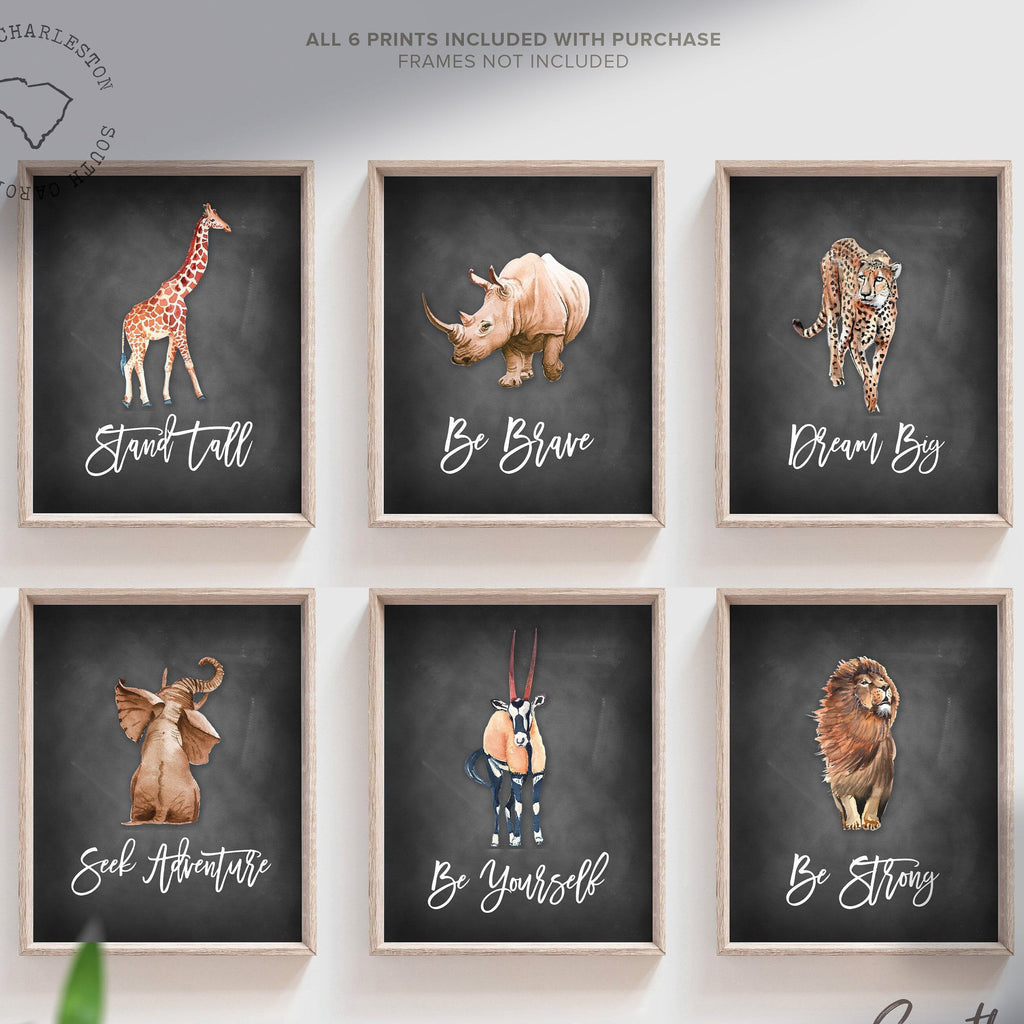 Product description: Safari watercolor animal theme prints including a giraffe, rhinoceros, leopard, elephant, antelope, and lion with charcoal chalkboard textured backgrounds. You can request to swap out any of the animals with a zebra, heron, flamingo, lioness, ostrich, parrot, or shakal. Please specify in the 'notes to seller' section during checkout. Other options are also available in my shop.