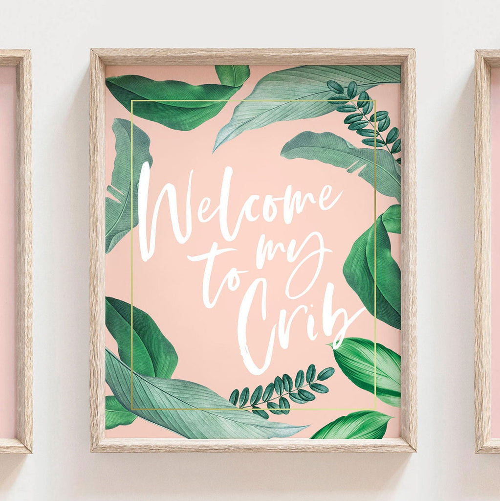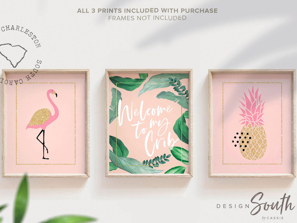 Welcome to my crib tropical flamingo nursery, tropical girls wall art set, girl nursery decor, pink nursery prints, baby girl gift flamingos